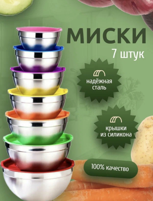 Нержавейка посуда набор с крышкой Набор мисок из нержавеющей пищевой стали с крышками. В комплект из 7 предметов входят высококачественные универсальные цветные миски из нержавейки и крышки из полупрозрачного полимера для емкостей. Каждая крышка идеально и плотно закрывает свою чашу, при этом легко снимается за счет удобной ручки. Размеры: 18 см, 20 см, 22 см, 24 см, 26 см, 28 см, 30 см. Модель предназначена для максимального удобства хранения продуктов, приготовления пищи. Не содержит вредных веществ, устойчива к ржавчине, долговечна. Многофункциональные контейнеры из полимеров замечательно подходят для смешивания нарезанных овощей, можно использовать как салатницы. Замешивания взбивания теста для миксера или венчика. Для маринования или хранения мяса шашлыка гриля рыбы и т.д. Применять вместо глубокой декоративной тарелки как фруктовницу конфетницу и тортовницу. Набор глубоких чашек из нержавеющей стали, незаменимый атрибут для каждой хозяйки... Что не маловажно гнездящиеся и штабелируемые миски в отличие от других громоздких тазиков, легко складываются один за другим и обеспечивают экономичное хранение в кухонных шкафах либо на столешнице. Прекрасно подходит для повседневного использования на вашей кухне, приготовления пищи и сервировки! Такая посуда из нержавейки проста в ручной чистке и безопасна для посудомоечной машины!