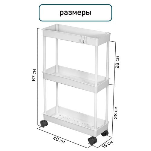Этажерка на колесиках стеллаж Стеллаж пластиковый 40х15х67 см, за счет универсального и популярного размера, хорошо впишется в современных домашний интерьер. В наборе идет одна этажерка универсальная. Стеллаж узкий облегчает процесс уборки и наведения порядка, делает хранение любых категорий вещей доступным и наглядным. Вам будет удобно расположить в нем бытовые предметы и вещи, которые вы часто используете. Этажерка на колесиках - незаменимый аксессуар в оформлении стеллажей и шкафов.