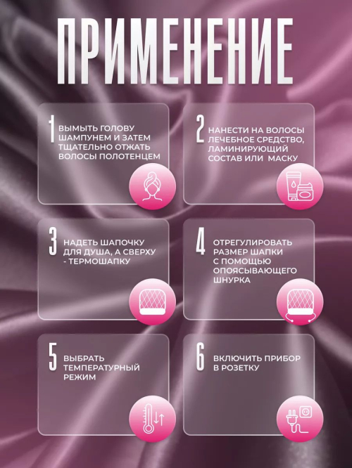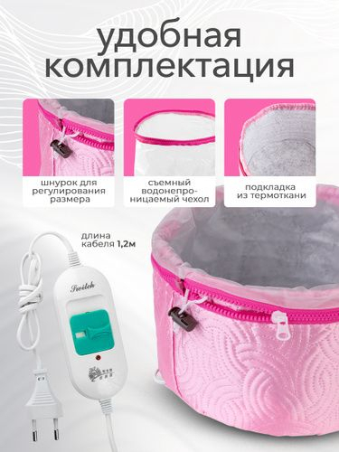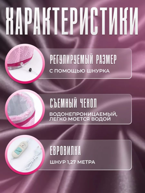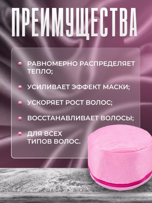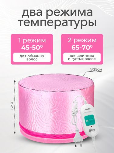 Термошапка СПА для волос Термошапка для волос профессиональная электрическая предназначена для ухода за волосами в домашних условиях. Парикмахерская шапка с подогревом для волос усиливает действие масок, филлеров, бальзамов, шампуней, сывороток, увлажнителей, кондиционеров, масел, спреев, тоников, кератинов и других косметических средств и улучшает их впитываемость до 10 раз! Электрическая шапка для волос сделает ваши локоны красивыми и блестящими и заменит дорогостоящие походы к парикмахеру и косметологу, ведь кроме лечебных процедур и масок, в ней удобно проводить укладку, ламинирование, окрашивание волос, коллагеновое обертывание. Волосы нуждаются в особом уходе и лечении, особенно после фена, плойки или утюжка. Подходит как для женщин так и для мужчин. Подходит для нормальных жирных и сухих волос. Может использоваться с кудрявыми и прямыми волосами разной длины при окрашивании, мелировании, завивке и лечении волос. Электрическая термошапка универсального размера, имеет внутренний шнурок, позволяющий отрегулировать ее под любой размер головы. Термошапка для волос профессиональная имеет 2 режима температуры (45 и 70 градусов) и функцию защиты от перегрева, обеспечивая вам максимальный комфорт и безопасность во время использования. Перед применением убедитесь в отсутствие в волосах резинок, крабиков, заколок, бантов, зажимов, невидимок и других украшений для волос и посторонних предметов. Применение термошапки поможет вам восстановить поврежденные волосы и подарить им блеск, красоту и здоровье! Не упускайте возможность создать свою домашнюю спа-процедуру и достичь салонных результатов без походов в салон.