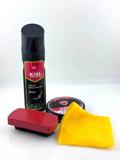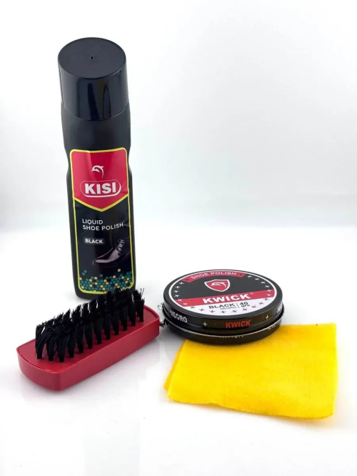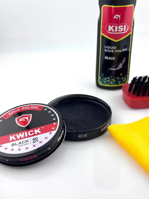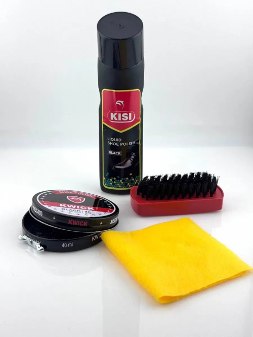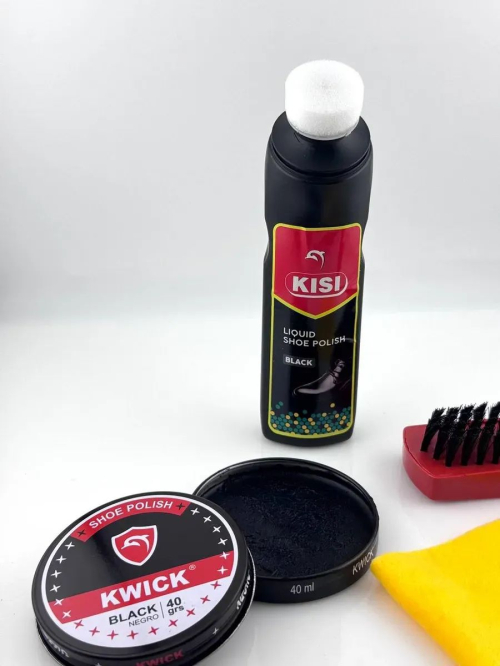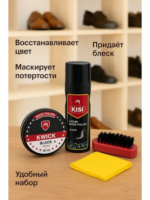 Набор для чистки обуви Набор для ухода за обувью KISI + KWICK — универсальное решение для ежедневного ухода за кожаной обувью. В комплект входит жидкая краска KISI, крем-краска KWICK, удобная щетка и салфетка. Средства восстанавливают насыщенный черный цвет, маскируют потертости и придают блеск, делая обувь аккуратной и ухоженной. Преимущества набора: Подходит для мужской, женской и детской обуви Восстанавливает цвет и блеск Маскирует царапины и потертости Компактный комплект удобно хранить и брать в дорогу Простое использование в домашних условиях Характеристики: Цвет: черный Назначение: для кожаной обуви Форма выпуска: жидкая краска, крем-краска в банке Страна производства: Китай Объем: 75 мл + 40 мл набор для ухода за обувью, крем-краска для обуви черная, жидкая краска для обуви, крем для обуви черный, набор для полировки обуви, средство для ухода за кожаной обувью, краска для обуви черная с щеткой.