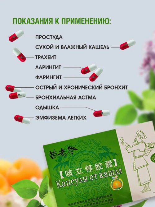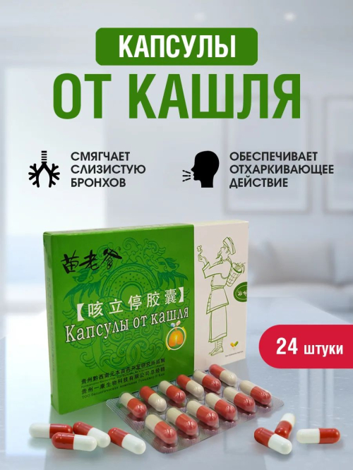 Капсулы от кашля Капсулы при сухом и влажном кашле при простуде и ОРВИ с кордицепсом 24 штуки - растительный препарат для лечения и профилактики заболеваний дыхательной системы представляет собой уникальное средство, которое эффективно борется с проблемами, связанными с дыханием. В упаковке данного препарата содержится 24 капсулы, которые обеспечивают быстрое выздоровление при различных заболеваниях легких, сопровождаемых кашлем, чувством стеснения и болью в груди, одышкой, першением и сухостью в горле. Капсулы содержат экстракты растений, включающие бады, витамины и другие полезные вещества. Они обладают противовоспалительным действием, снимают спазм мускулатуры бронхов, устраняют кашель, смягчают слизистую бронхов и обеспечивают отхаркивающий эффект. БАД гриб кордицеп в капсулах также позволяет справиться с простудой и облегчить симптомы болезни. Он улучшает общее состояние организма, повышает его защитные функции и способствует укреплению здоровья, особенно в сезон простуд и вирусных эпидемий. Китайские таблетки от простуды, включенные в состав препарата, обладают отличными свойствами в виде облегчения дыхания, отхождения мокроты и снятия приступов астмы. Они также снимают воспалительные процессы и обладают мощным антисептическим действием. Применение этого средства позволяет поддерживать здоровье слизистой оболочки верхних дыхательных путей и полости рта, убирает осиплость и возвращает потерянный голос. Оно также помогает очищать легкие, затормаживает процесс образования вредной слизи, восстанавливает слизистую оболочку бронхов и реснитчатого эпителия, обеспечивая кровь большим количеством кислорода. Кардицепс в таблетках китайский рекомендуется применять при следующих показаниях: эмфизема легких, одышка, бронхиальная астма, острый и хронический бронхит, фарингит, ларингит, трахеит, сухой и влажный кашель, а также простуда. Способ применения и дозы: рекомендуется принимать 2 раза в день по 1-2 капсулы. Данный препарат соответствует следующим запросам: от кашля, от горла, кашель, влажный кашель, сухой кашель, воспаление, отхаркивающие, противовоспалительное, снимает боль, бад, бронхи, легкие, здоровье, мокрота, дыхание, затрудненное дыхание, травы, лекарственные травы, экстракт, витамин С, экстракты, ОРЗ, ОРВ.