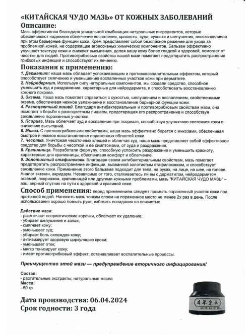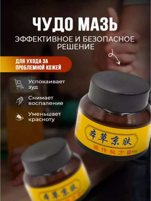 Травяная Чудо-мазь китайская мазь под названием "本草京肤" (Běncǎo Jīngfū), которая позиционируется как "чудо-мазь" или "чудо-крем" для решения различных проблем с кожей. Она продается в баночках по 50 г.
