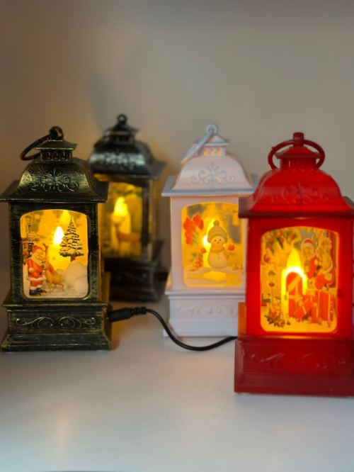 Внутри фонарей находятся фигурки, изображающие сцены Рождества, например, Деда Мороза, снеговика или оленей.