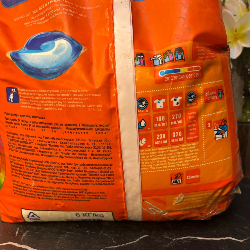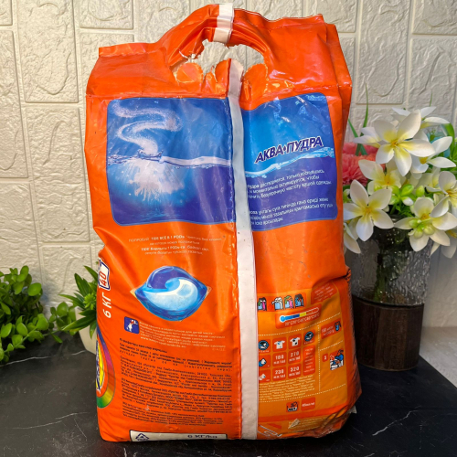 Упаковка содержит 6 кг порошка и рассчитана на 40 стирок.