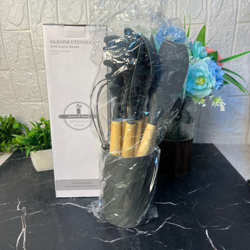 набор кухонных принадлежностей из силикона с деревянными ручками.