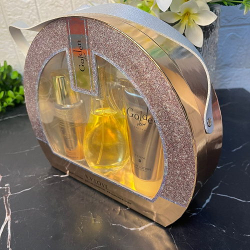 Набор включает в себя парфюмерную воду, лосьон для тела и парфюмированный спрей для тела.