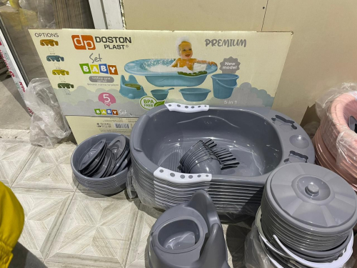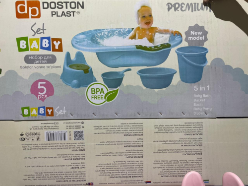 В комплект входят детская ванночка, горшок, ведро, ковш и миска (или набор мисок).