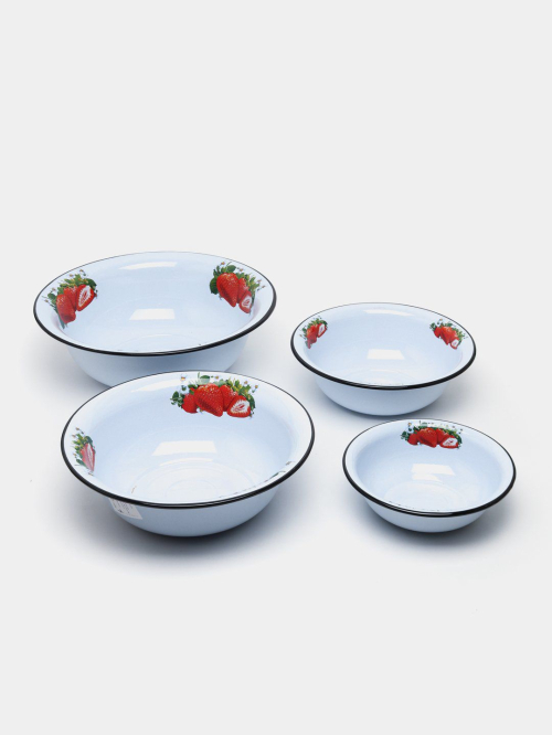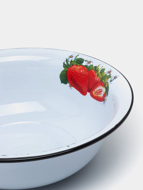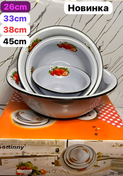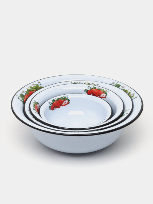 Эмалировнный таз Кухонный набор от Gottinny набор эмалированных тазов (мисок) с рисунком клубники. Это прочные и легкие кухонные принадлежности, которые подходят для мытья посуды, сервировки фруктов или смешивания ингредиентов.