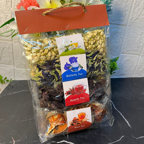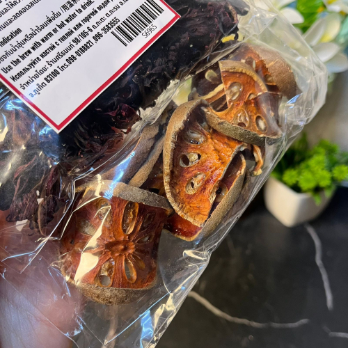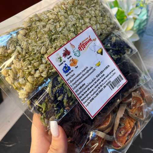 Смесь Тайского травяного чая из цветков Этот продукт представляет собой смесь тайского травяного чая из цветков клитории тройчатой (синий чай Анчан) и сушеных плодов баиля (матум) от производителя Sri Thanon. Смесь предназначена для заваривания горячей водой в качестве полезного напитка.