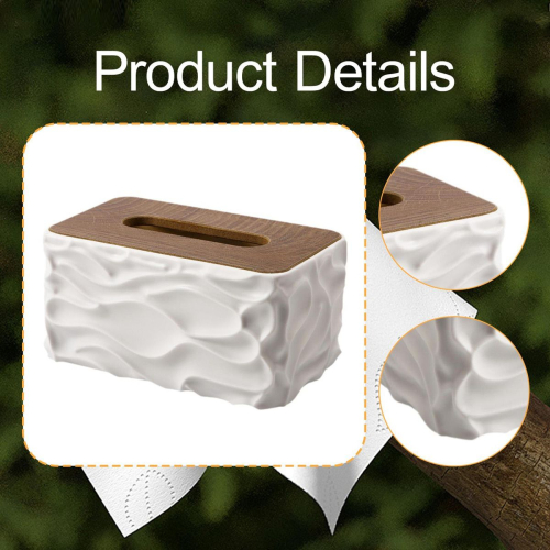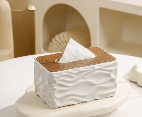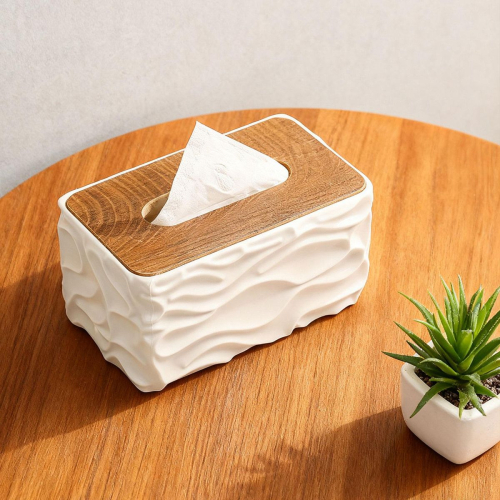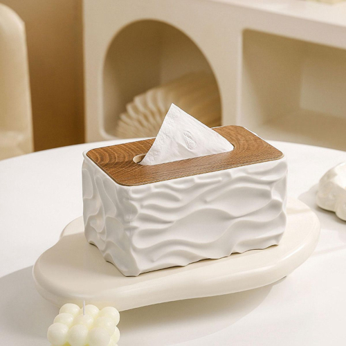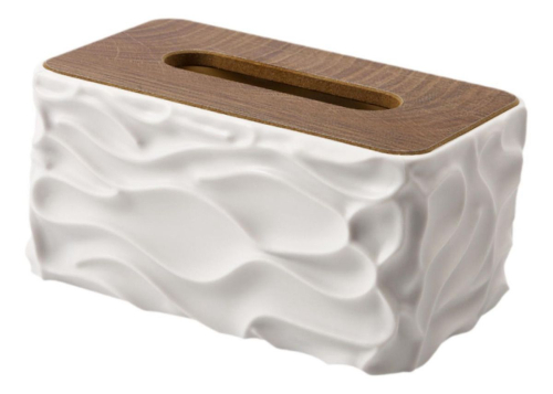 Керамическая Органайзер для салфеток белая керамическая коробка для салфеток (салфетница) с крышкой из бамбука или дерева. Изделие имеет волнистый, рельефный дизайн корпуса и плоскую деревянную крышку с прорезью для удобного извлечения салфеток.