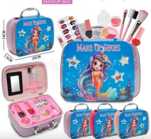 Включает в себя косметичку-кейс с изображением русалки, лаки для ногтей, тени для век, помаду и кисточки.