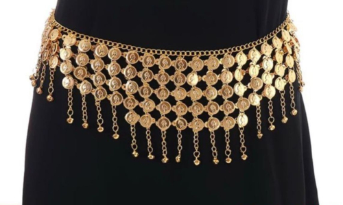 Золотой пояс-монета для танцев Такой пояс-монисто необходим для эффекта танца восточной красавицы Шехерезады! Танцуя в таком поясе, вы непременно передадите зрителю шелест монеток и всю красоту восточноготанца! Длину пояса можно регулировать за счет цепочки с карабином,