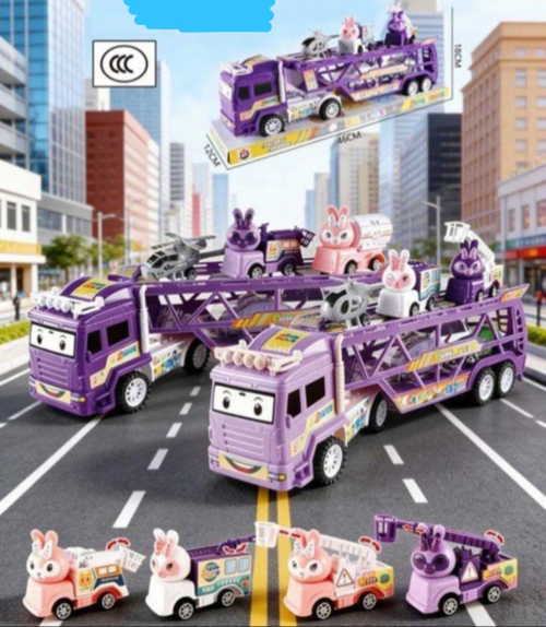 Комплектация: Набор включает в себя большой трейлер-автовоз и несколько единиц дополнительной техники (мини-машинки, вертолеты).