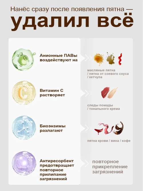 Назначение: Удаление пятен от соков, соусов, кофе, масла, косметики и вина.