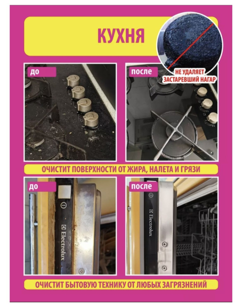 Назначение: Быстрое удаление стойких загрязнений, жира, пригоревшей пищи, окислов и ржавчины с различных поверхностей (металл, плитка, мрамор).
